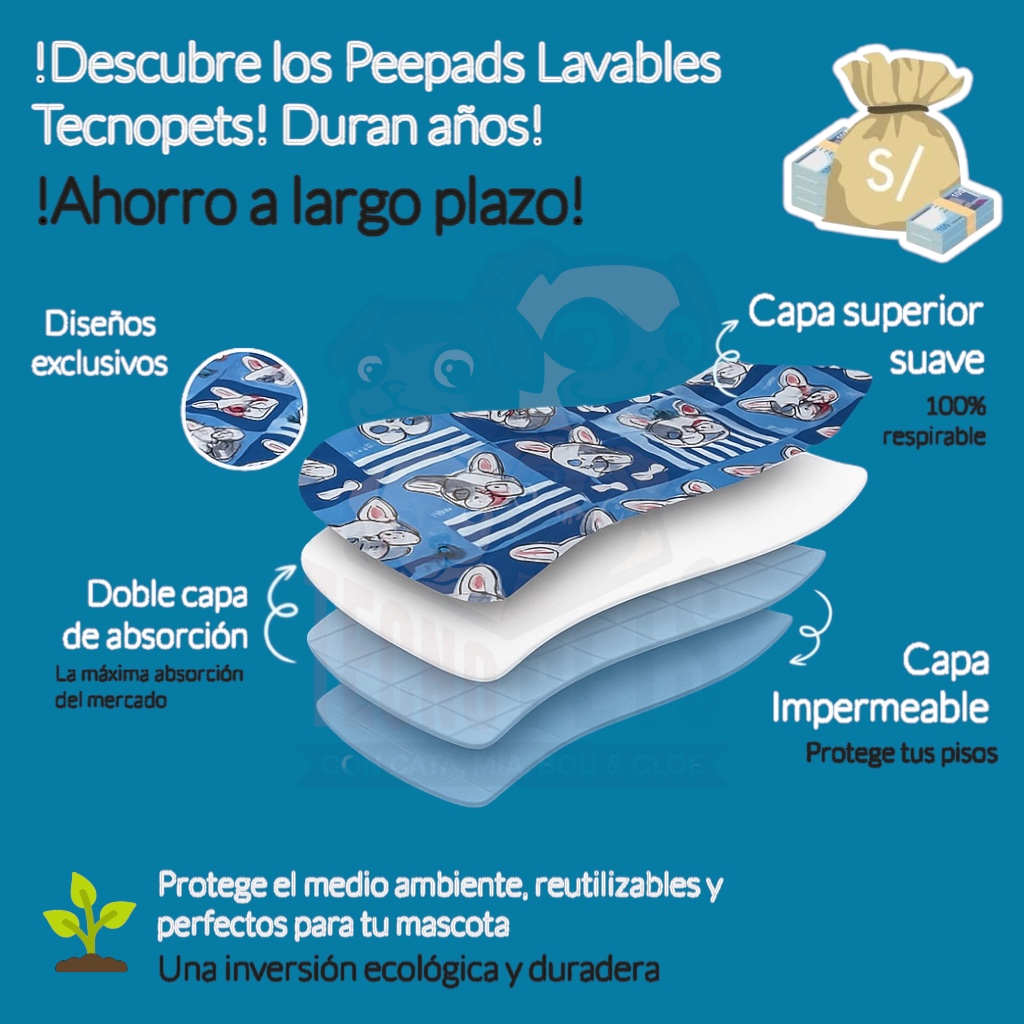 Nuestro PeePad Tecnopets está diseñado para eliminar olores, evitar filtraciones y reemplazar para siempre los pañales descartables o los pastos artificiales o reales que tienes que cambiar en menos de 1 mes. Ahorra dinero, tiempo y estrés.