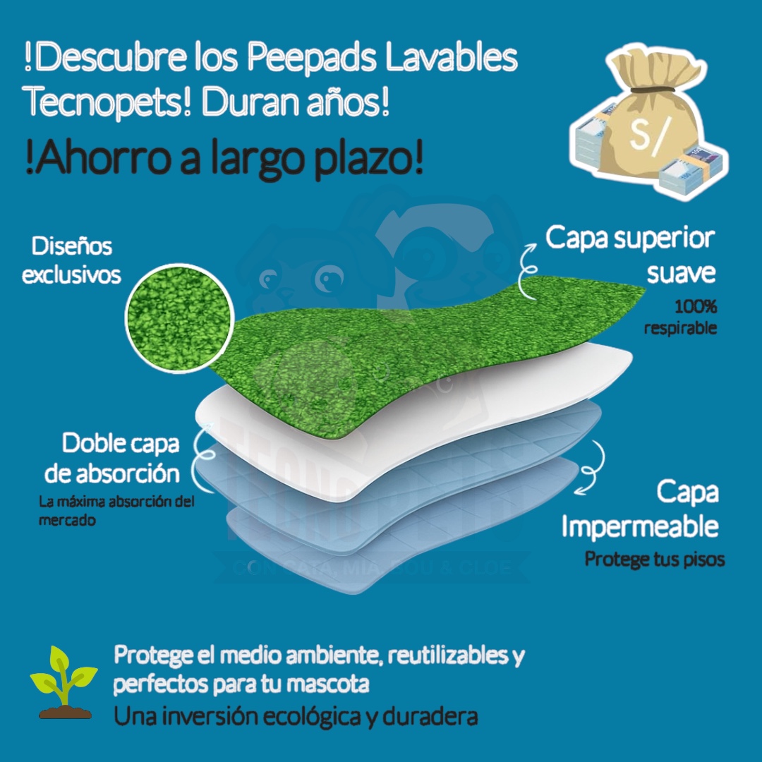 Nuestro PeePad Tecnopets está diseñado para eliminar olores, evitar filtraciones y reemplazar para siempre los pañales descartables o los pastos artificiales o reales que tienes que cambiar en menos de 1 mes. Ahorra dinero, tiempo y estrés.